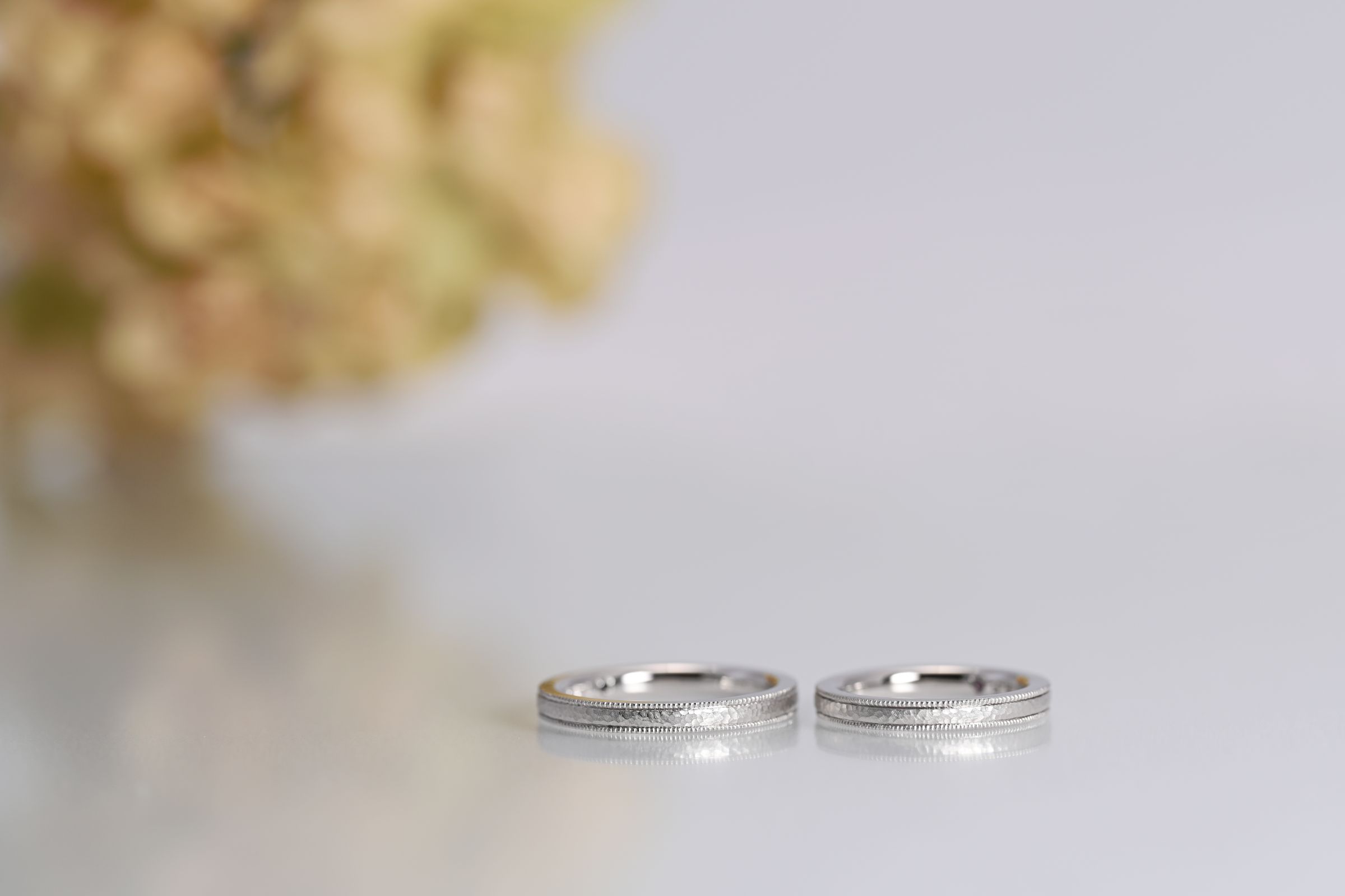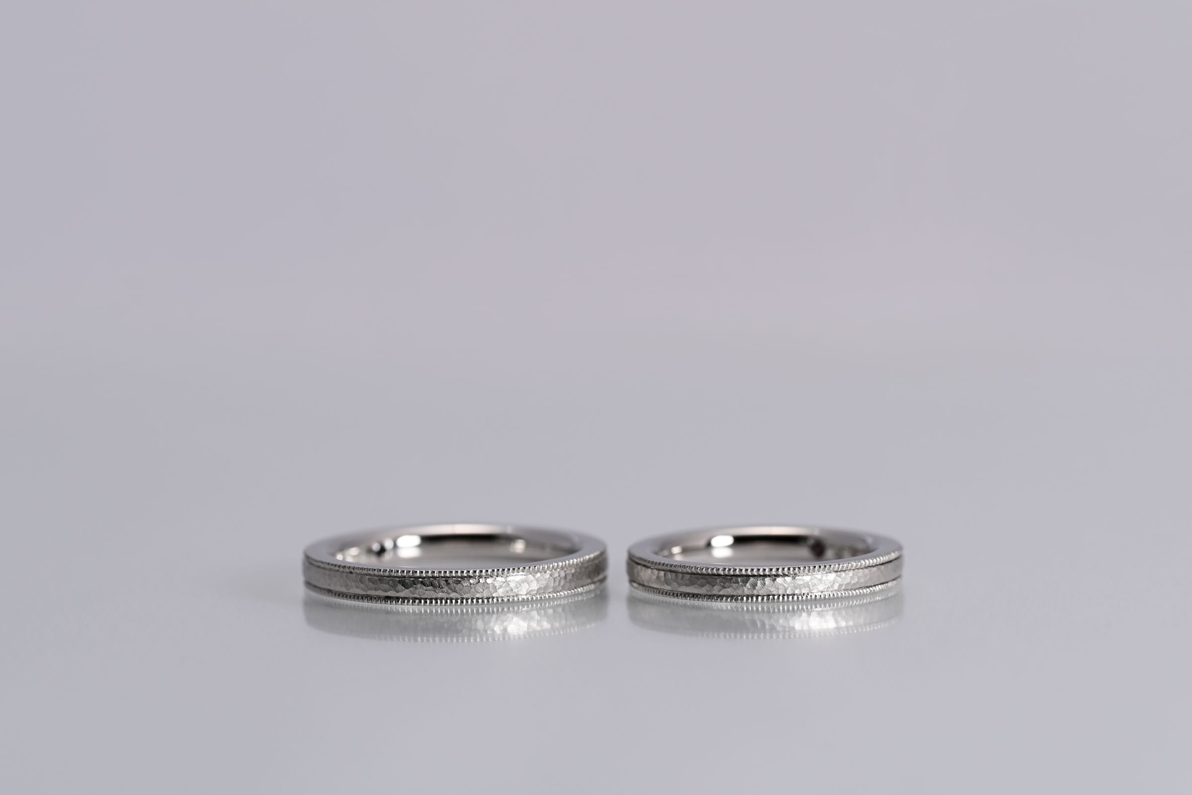 槌目のマリッジリング 2025.10.06 コラム 製作実例 プラチナで少し幅広の槌目テクスチャー。 両端にミルグレイン。 使い続けることで、さらに味わい深く変化していく経過をお二人で楽しんで頂けるマリッジリング。 1つ前のページへ戻るBlog一覧へ戻る