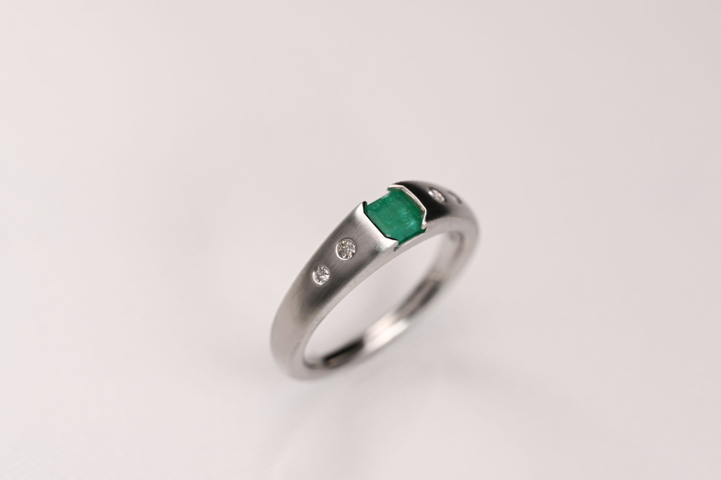 リングの表面はヘアラインで仕上げ、渋い輝きがエメラルドとダイアモンドが浮かび上がるように感じま